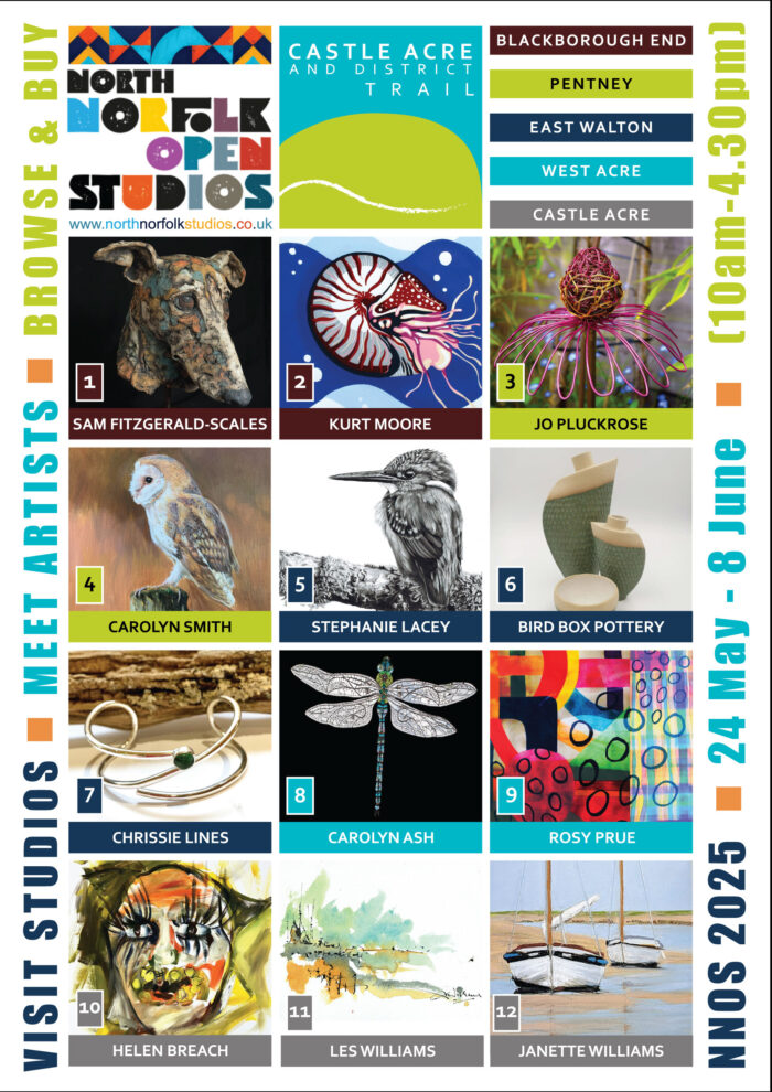 I’m taking part with the Castle Acre trail in West Norfolk that has 12 amazing artists this year. It includes paintings, ceramics and stoneware, jewellery, garden sculptures, prints, mosaics, drawings and gifts. Their studios are open, free to visit and all are willing to show you what they do with lots of goodies on show for purchase at reasonable prices. It is well worth a visit and situated aside the beautiful river Nar – a rare chalk river and with the benefits of a castle and a priory open to visitors what a great day out it can be.