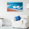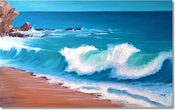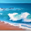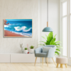 Oil on stretched canvas set into a natural wood frame – sitting on a quiet beach listening to the waves is one of life’s pleasures.